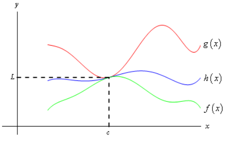 The squeeze theorem states that if one function always lies between two functions over an open interval containing $c$, and that the limit of both outside functions at $c$ is $L$, then the limit of the middle function must be $L$ also (see Figure 1).